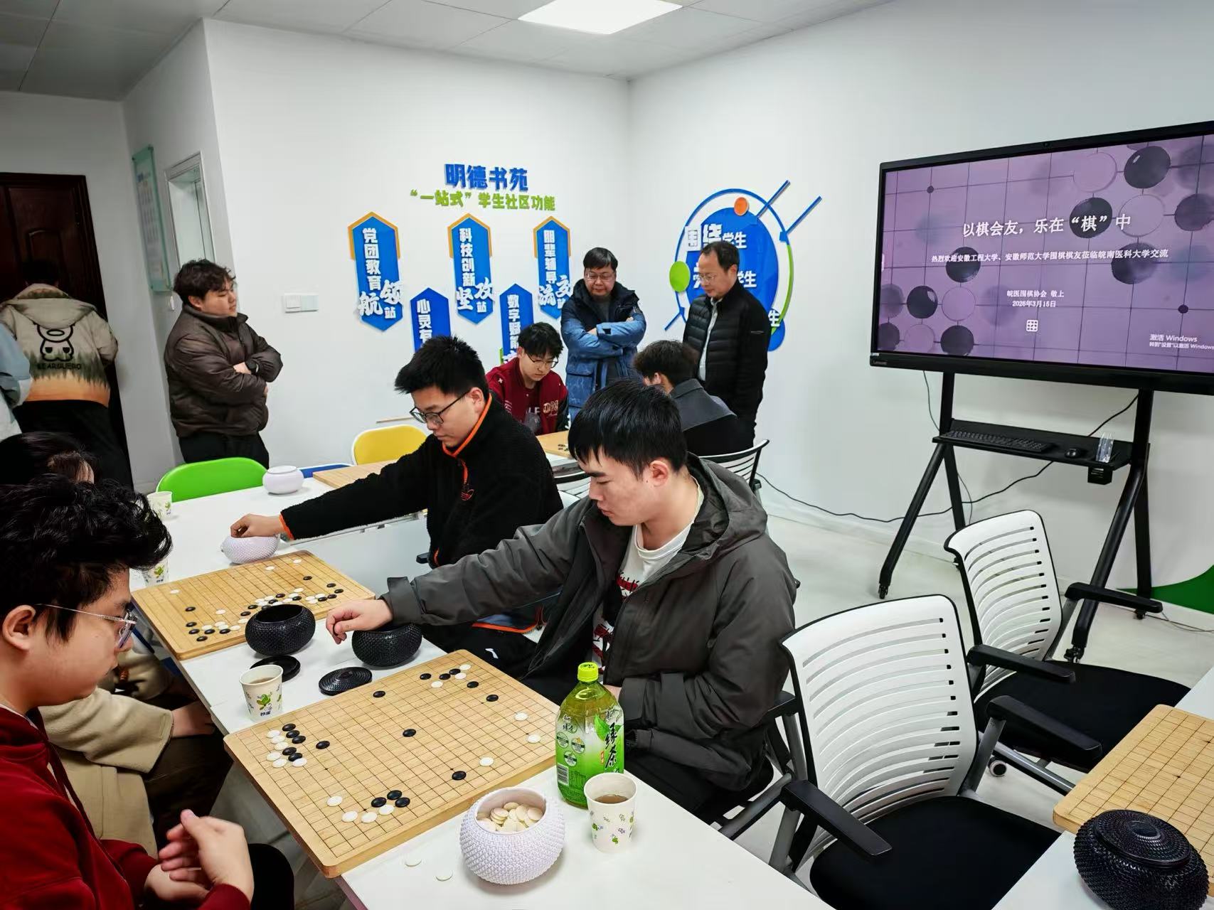 本次活动邀请了来自安徽工程大学、安徽师范大学的丁跃翔、刘承炀、宋鉴宇三位棋友到场交流。三位均为业余5段实力棋手,棋艺精湛、经验丰富。我校及安徽师范大学的老师也来到现场,与同学们一同对弈、交流棋艺。