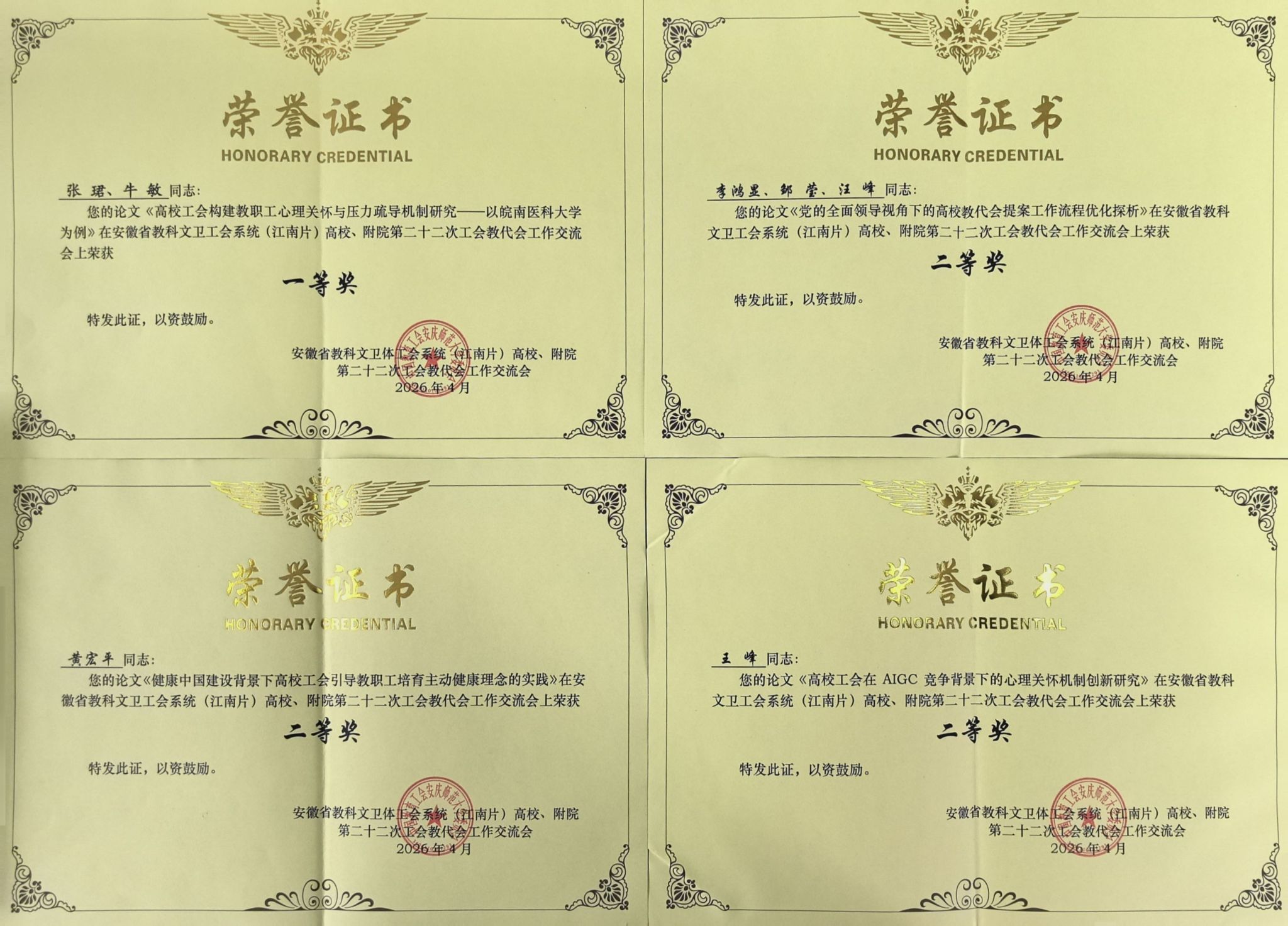 会议表彰了本次工作交流会优秀论文,获奖论文作者代表围绕青年教师成长发展、工会组织规范化建设、教代会制度完善、劳模创新工作室培育等关键议题,开展深度研讨、分享研究成果。我校一等奖论文作者张珺作《高校工会构建教职工心理关怀与压力疏导机制研究——以皖南医科大学为例》专题发言,结合我校实践,就高校教职工心理关怀体系构建提出具体思路和可行路径。据悉,此次会议共征集工会教代会相关论文38篇,我校选送的作品斩获一等奖1篇、二等奖3篇,充分展现了我校工会工作研究的扎实成效。